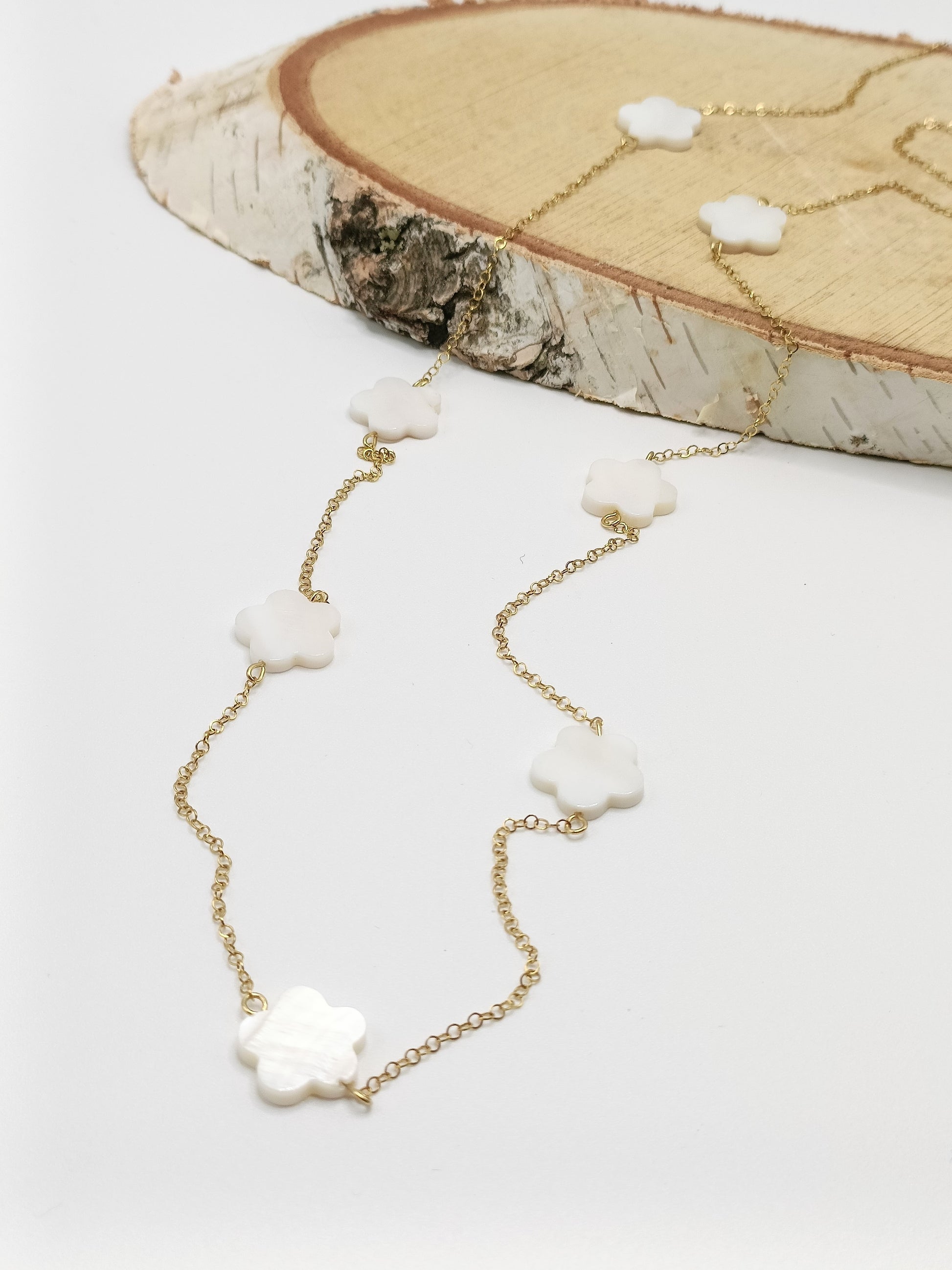 Sautoir doré et fleurs en nacre blanche à porter de façon classique ou en décalé ( sept nacres ).