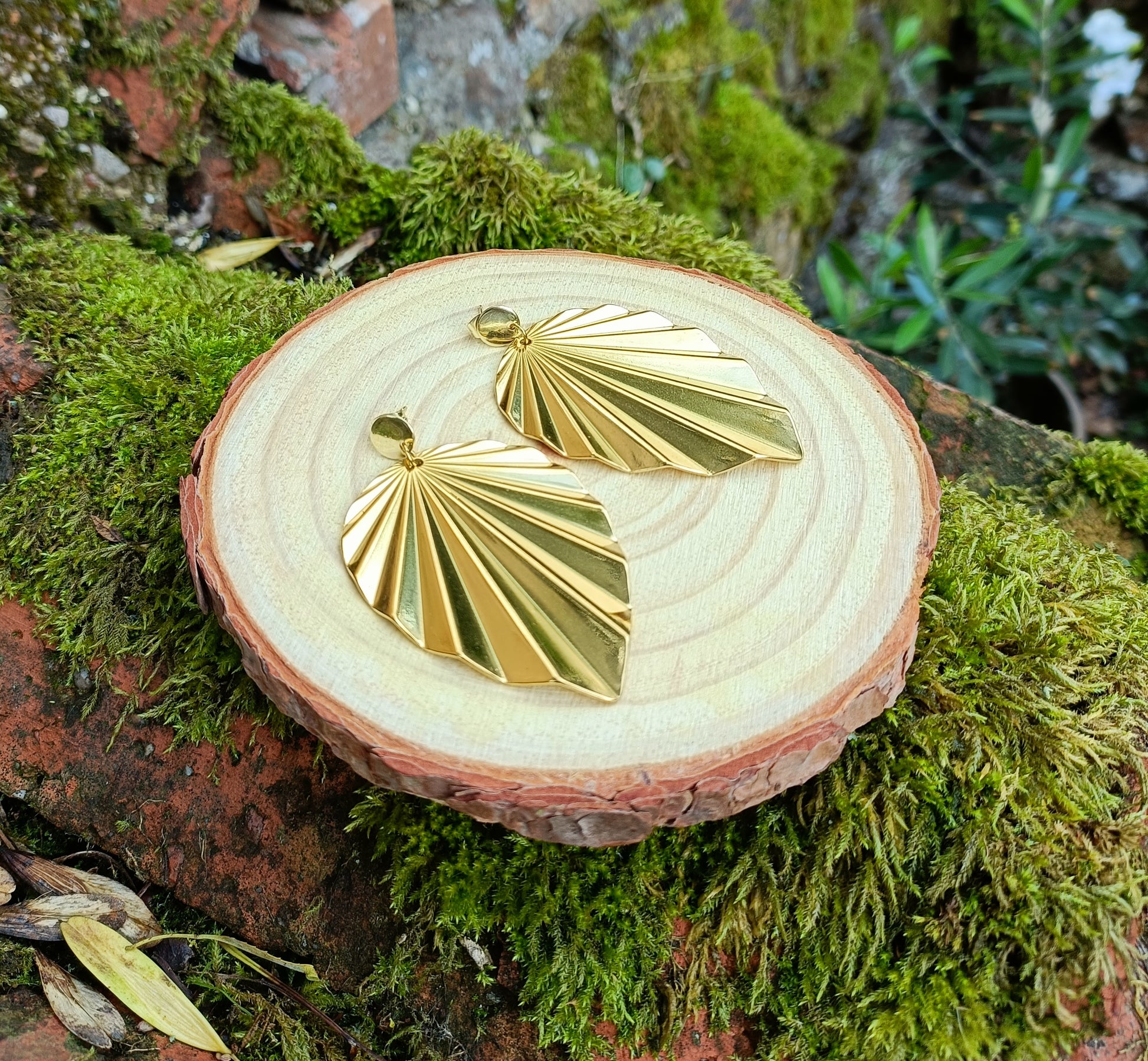 Les grands pendentifs feuilles striées sont en acier inoxydable, recouverts d'une couche d'or 18K.
